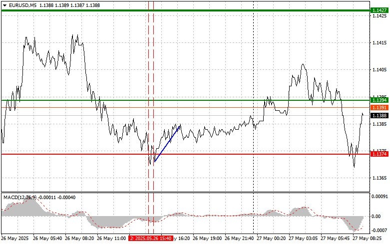 Первый тест цены 1.1374 во второй половине дня пришелся на момент, когда индикатор MACD много прошел вниз от нулевой отметки, что ограничивало нисходящий потенциал пары. Спустя короткий промежуток времени состоялся еще один тест этого уровня, что привело к реализации сценария №2 на покупку и вылилось в рост пары лишь на 10 пунктов.