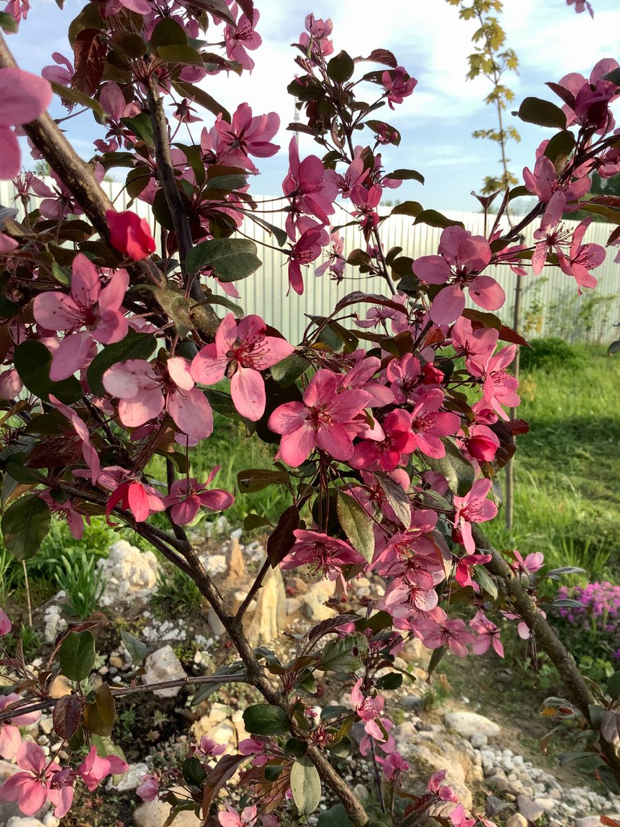 Хорошо, что в этом сезоне повезло застать декоративную яблоню Скарлет в цвету. Приехали на дачу и в первый день она стояла во всей красе. Успели поснимать и полюбоваться. И буквально за пару дней жара и суховеи красоту эту снесли, как не было..