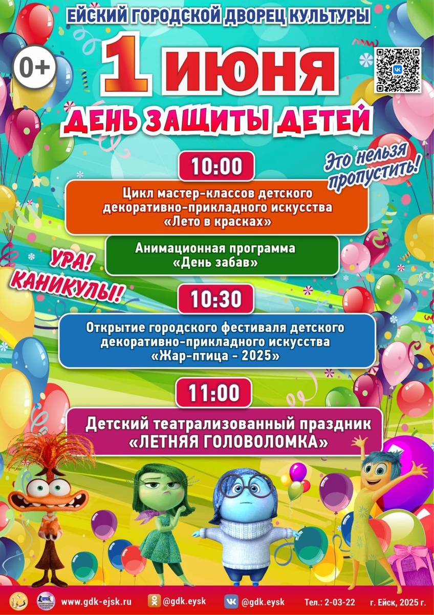 🎈1 июня - самый детский день! Ейский городской дворец культуры приглашает мальчишек и девчонок, а также их родителей на праздник добра и улыбок: - 10-00 – (в малом фойе) будет работать выставка животных эколого-биологического центра города Ейска; - 10-30 – начнёт работать интерактивная площадка «День забав» - весёлые аниматоры, игры, хороводы и флеш-мобы; - 10-30 - (в большом фойе ГДК) состоится открытие городского детского конкурса «Жар-птица 2025», которая порадует гостей праздниками циклом мастер-классов по ДПИ «Лето в красках»; - 11-00 -(в концертном зале) состоится театрализованное представление «Летняя головоломка». 🎉 Всех юных зрителей ждёт встреча с любимыми героями мультфильмов, игро-танцы и много музыки из любимых сказок. А лучшие детские творческие коллективы порадуют интересными номерами. Подарите себе и своим близким настоящие семейные выходные!