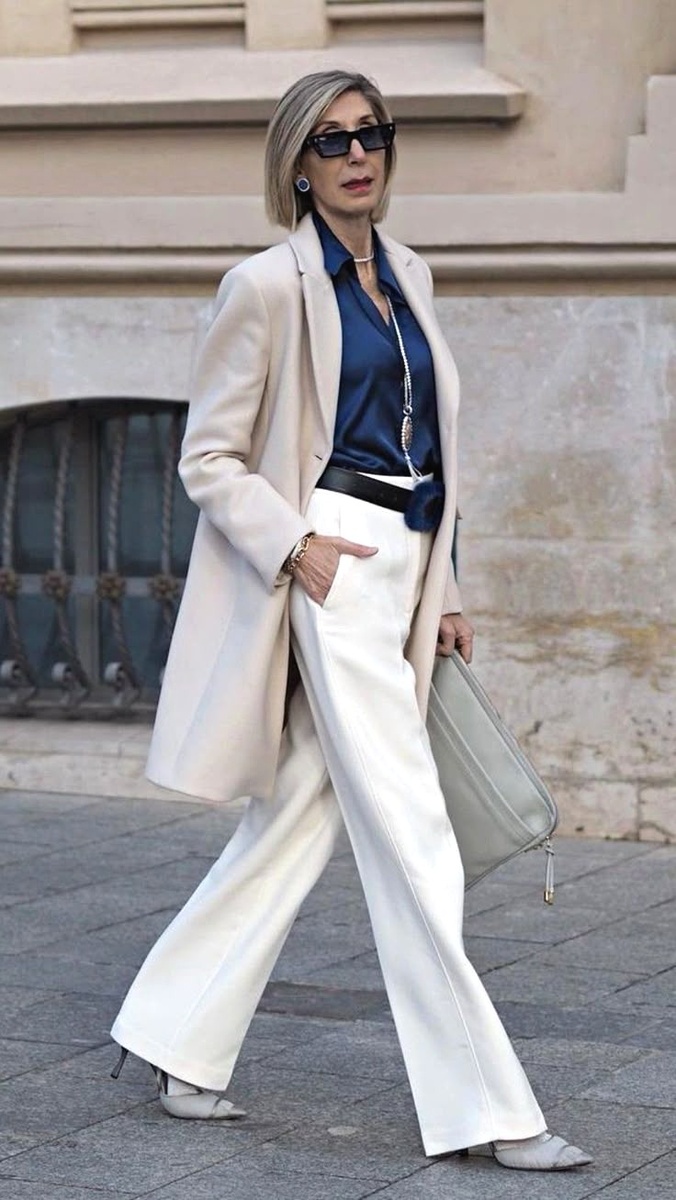Крой. Для женщин после 40 лучше прямой силуэт или легкое расклешение. Обтягивающие модели в белом цвете подчеркивают недостатки.