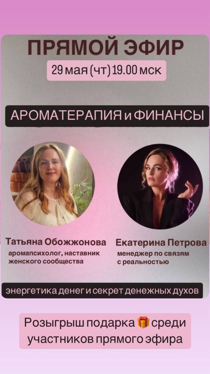 Дорогие🌿, приглашаю на прямой эфир 29 мая (чт) 19.00 мск 🌹АРОМАТЕРАПИЯ и ФИНАНСЫ💰 Программа: ▪️эфирные масла для привлечения денег, ▪️связь ароматов и подсознания: как запахи влияют на наше восприятие денег и уверенности в себе, ▪️энергетика денег и секрет денежных духов. Розыгрыш подарка 🎁 среди участников прямого эфира.