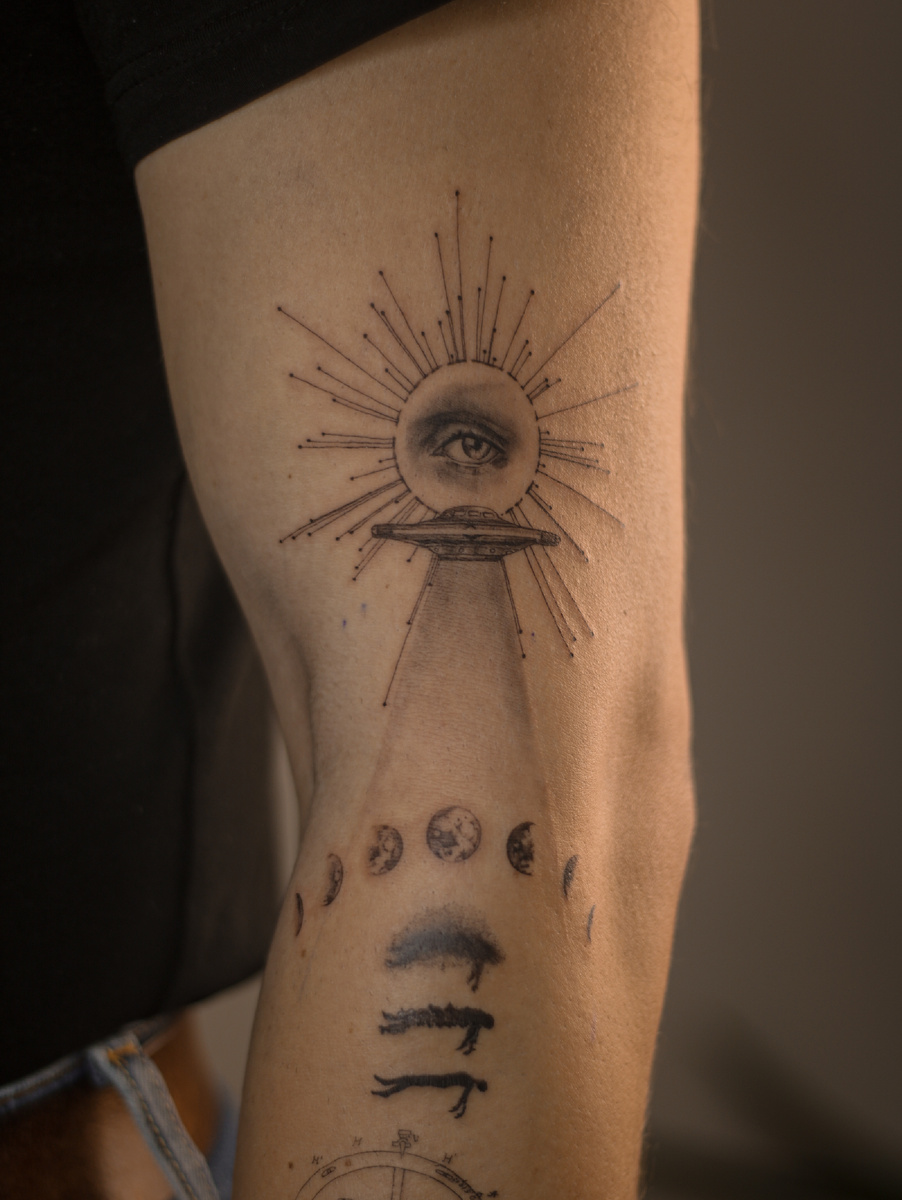 Сегодня произошёл один из тех маленьких, но очень приятных эпизодов, которыми невозможно не поделиться. Получаю сообщение — фото. На нём — чья-то рука, изображение размытое, видно, снимали наспех. Но я сразу узнаю работу. Моя. Крупным планом — татуировка с глазом, которую я делала пару лет назад. Под фото — подпись: «Смотри, с кем в лифте поговорила. По глазу узнала!» Я улыбаюсь. Потому что узнаваемость — это приятно. А такие совпадения — вообще отдельный вид радости. Мне всегда нравились эти «пересечения миров»: когда сталкиваешься с кем-то знакомым в неожиданном месте, особенно в другой стране или городе. А тут — вроде бы обычный лифт. Но два незнакомых между собой человека узнают друг друга… по татуировке. Через пару часов пишет он — тот самый парень с татуировкой-глазом: «Сегодня на работе какая-то девочка в лифте спросила, не ты ли мне делала татуировку. Попросила сфотографировать, чтобы тебе отправить. Я решил уточнить, показала ли тебе? А то ситуация какая-то странная…» И я см