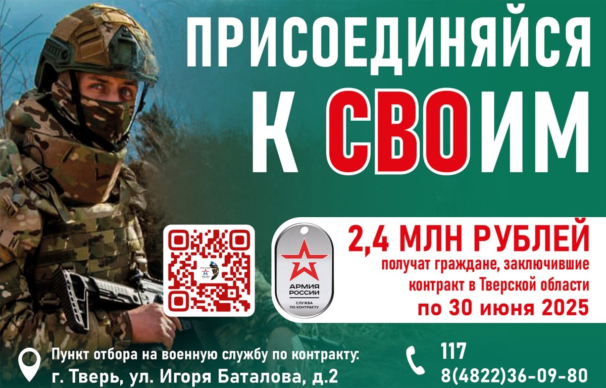 В Тверской области до 30 июня продлён срок действия увеличенного размера единовременной региональной выплаты при заключении контракта о прохождении военной службы Решением Губернатора Игоря Рудени в октябре прошлого года в Верхневолжье размер выплаты гражданам, которые заключат контракт о прохождении военной службы, был увеличен до 2 млн рублей. С учетом федеральной выплаты военнослужащие получают единовременно 2,4 млн рублей. В Тверской области также предоставляют единовременную денежную выплату жителям, оказавшим содействие в привлечении граждан на военную службу по контракту (за исключением сотрудников силовых структур). Размер выплаты - 100 тыс. рублей за каждого привлеченного к службе гражданина. Срок подачи заявления на предоставление данной выплаты продлен по 30 июня. Для поступления на военную службу необходимо обращаться в военкомат по месту жительства или пункт отбора на военную службу по контракту по Тверской области по адресу: г. Тверь, ул. Игоря Баталова, д. 2. Телефоны