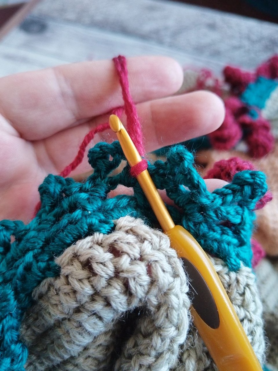 4. Связав все ст, делаем 3 вп и закрепляем соед столбиком в то место, куда крепили нить.