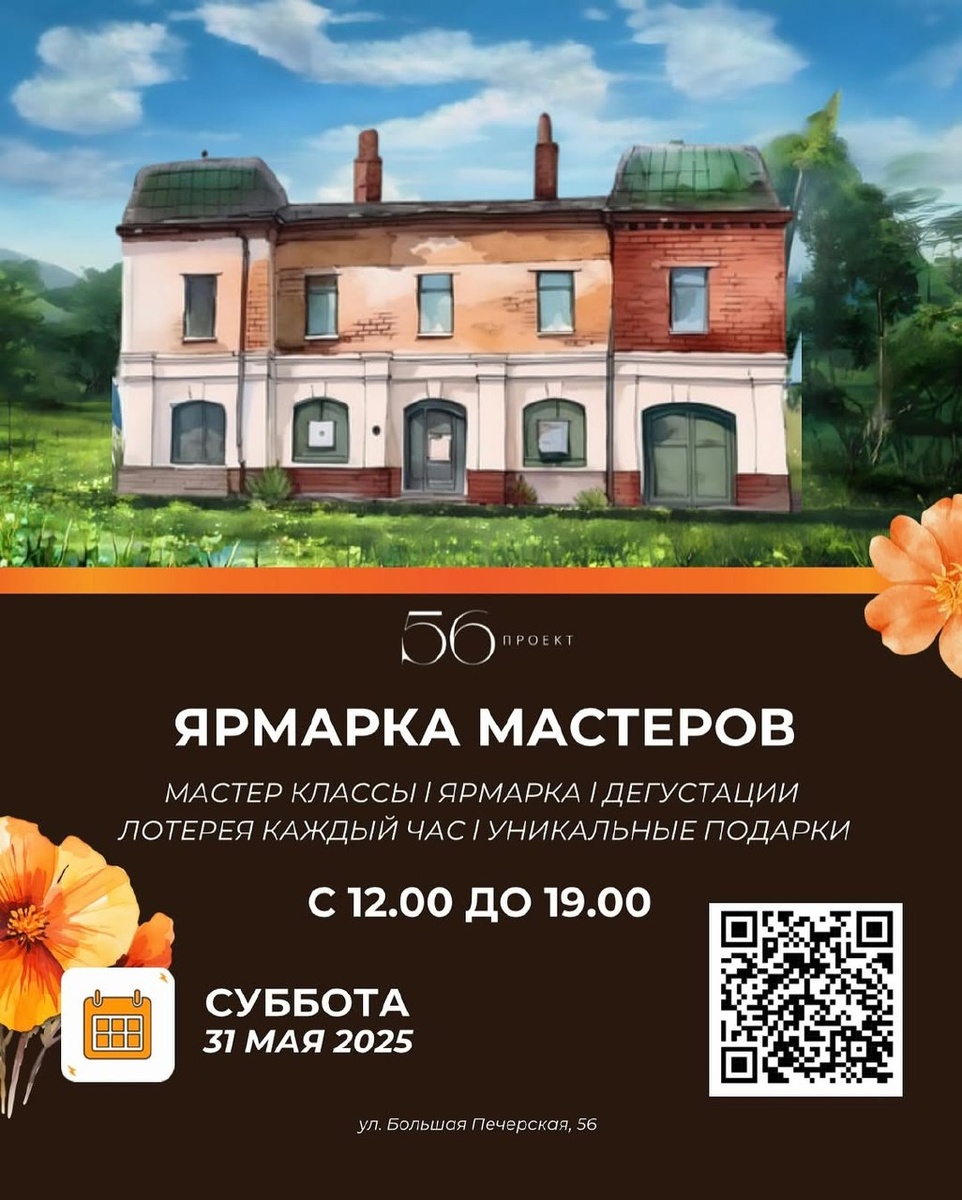 31 МАЯ в «Проекте 56» — новый формат ярмарки и мастеровой! ✨ С 12:00 до 19:00 : 🎨 Мастер-классы — создавайте своими руками и забирайте с собой! 📸 Фотозона — красивые кадры обеспечены. 🎁 Розыгрыши призов — удача может быть на вашей стороне! 🛍 Уникальные изделия мастеров — украшения, декор, аксессуары и многое другое. 📍ул. Большая Печерская, 56 #яместный