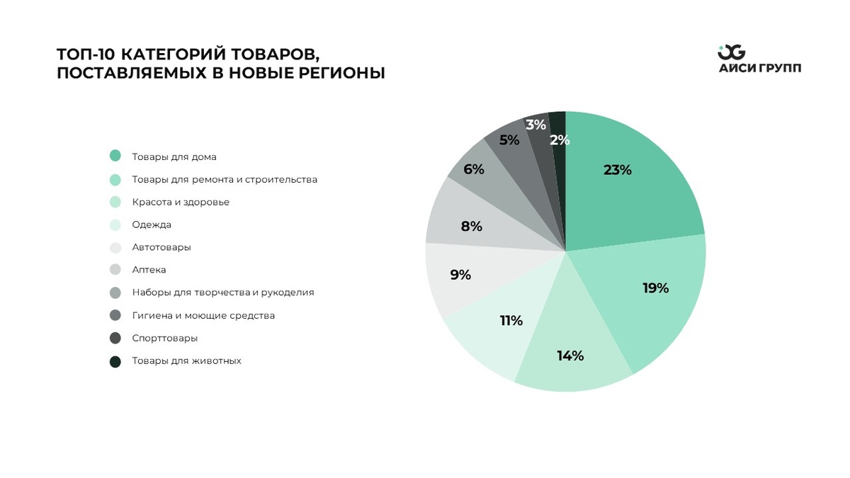 “Объем онлайн-покупок в Новороссии за период с апреля 2024 по апрель 2025 увеличился в 40 раз, а с начала 2024 года по текущий период - в 1000 раз. Мы ожидаем, что к концу 2025 года количество отправлений достигнет 9,5 млн в месяц”, - об этом заявил генеральный директор “АйСи Логистик” (“АйСи Групп”) Михаил Сентемов на выставке ECOM Expo, которая завершилась в Москве. По данным сервиса +7 Доставка (“АйСи Логистик”), который осуществляет доставку отправлений и товаров из федеральных интернет-магазинов в пункты выдачи заказов на территории ЛНР, ДНР, Херсонской и Запорожской областей, количество отправлений в месяц с апреля 2024 по апрель 2025 выросло с 145 тысяч до 5,7 миллионов. Всего за год с апреля 2024 года сервис уже доставил более 23,5 миллионов заказов в Новороссию. Какие товары заказывают жители новых регионов в интернет-магазинах Наибольшей популярностью у жителей Новороссии пользуются товары для дома (23%), затем следуют товары для ремонта (19%), в тройке лидеров также товары д