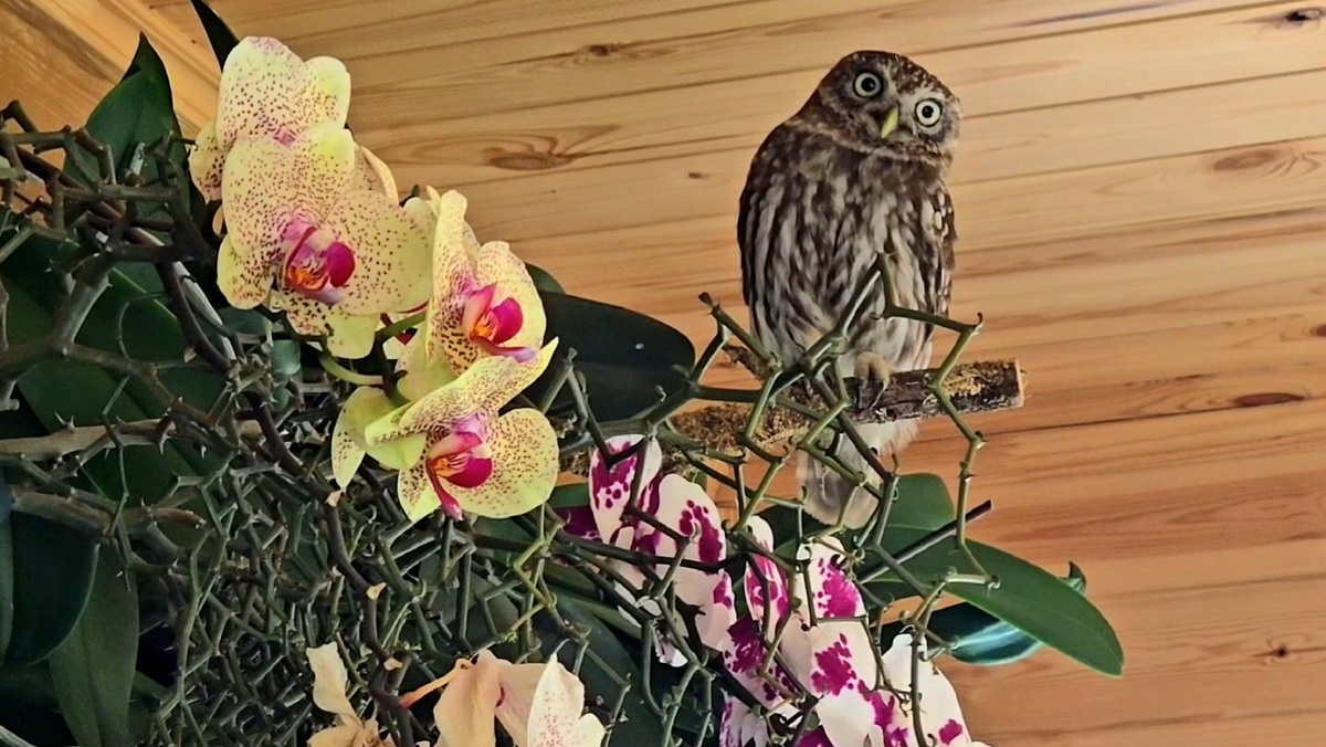 Сыч Лучик очень ответственно подходит к уходу за растениями у себя в совешне.