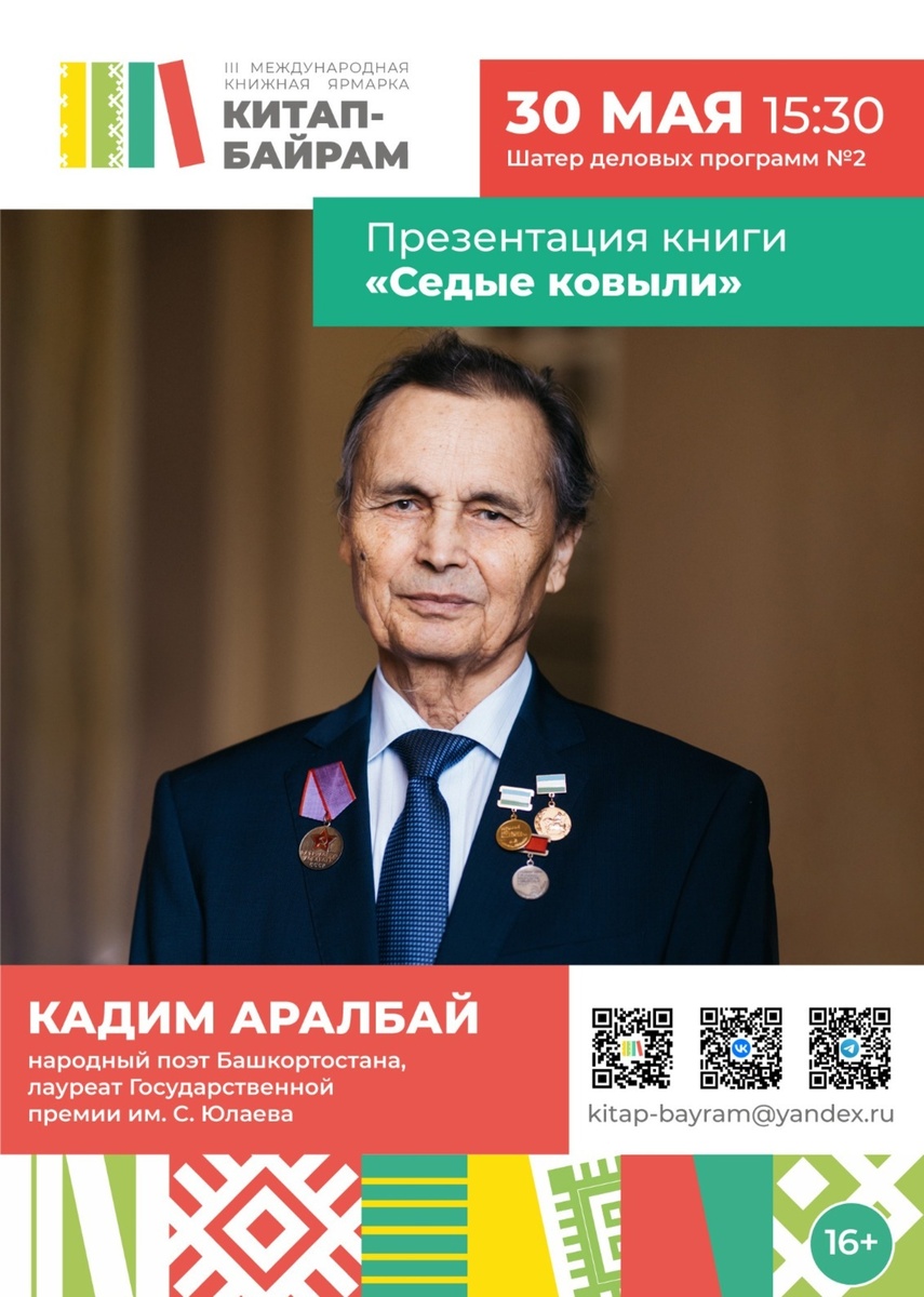 В рамках III Международной книжной ярмарки «Китап-Байрам» состоится презентация новой книги народного поэта Башкортостана Кадима Аралбая «Седые ковыли». В рамках III Международной книжной ярмарки «Китап-Байрам» состоится презентация новой книги народного поэта Башкортостана Кадима Аралбая «Седые ковыли». Мероприятие запланировано 30 мая в 15.30 во втором шатре. На презентации прозвучат стихи, можно будет пообщаться с автором, задать вопросы, взять автограф. Книга на днях вышла в свет в Башкирском издательстве «Китап» имени Зайнаб Биишевой. В неё вошли стихи и поэмы Кадима Аралбая в переводе на русский язык. Среди переводчиков есть такие мастера перевода, как Дим Даминов, Газим Шафиков, Анатолий Майоров и другие, а также начинающие переводчики — дочь поэта Лейла Аралбаева и его племянница Гузель Мукминова. «Для меня это очень долгожданная книга, радуюсь, как молодой автор, — признался писатель. — Это моя вторая книга на русском языке, а первый сборник переводов „Гонец“ был опубликован б