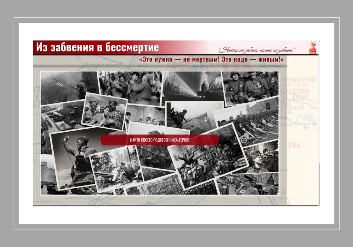 Из забвения в бессмертие! В ознаменование 80-летия Победы в Великой Отечественной войне 1941-1945 годов Волгоградская академия МВД России дает старт уникальному героико-патриотическому проекту «Из забвения в бессмертие!». Стратегической задачей проекта является восстановление сведений о месте и времени гибели защитников Родины. https://xn----7sbh4abisab1b4j.xn--p1ai/misc/25887-iz-zabveniya-v-bessmertie.html