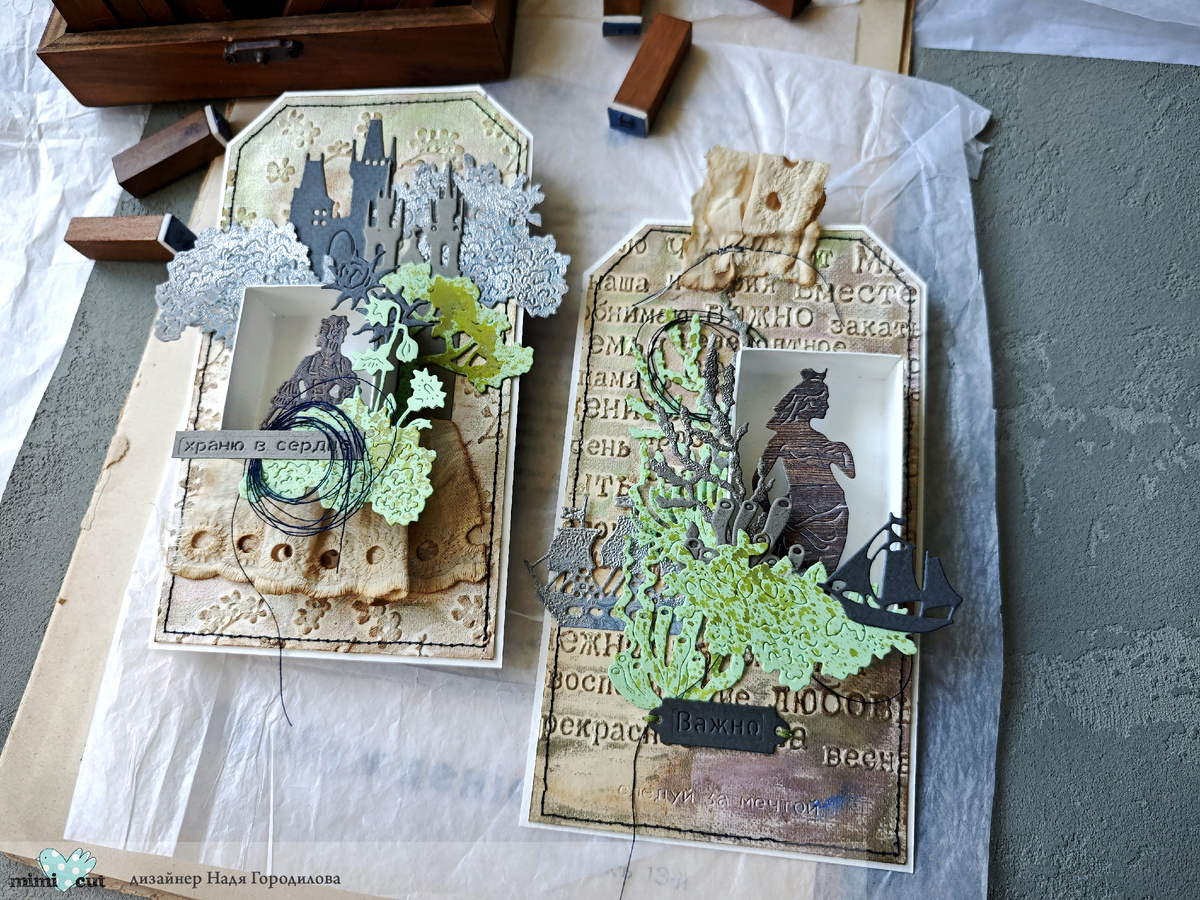 Привет - привет! С вами Надя! Не удержалась и сразу применила новинки из последнего релиза Мимикат! Папки "Незабудки" и "Ни слова больше" просто невероятные, идеальный рельеф! Подчеркнула его дополнительно золотыми красками и дистресс-чернилами. Донышко коробочки из сета "В спичечном коробке" как своеобразные окошечки в прошлое, хранители воспоминаний. Незабудки на фоне и силуэты замков "Силуэты старого города" утопают в зелени деревьев "Лесов таинственная сень" и "В тот единственный сад". Дама из "Галантный век" романтично смотрит вдаль из своей коробочки, в обрамлении цветов "Лето в кармане" и "Космеи скромные цветы")) Коробочку я сделала квадратной, а дама хранит в сердце явно какие-то романтичные воспоминания )) Папка с надписями задала второму тегу настроение дальних путешествий, экспедиций по исследованию дальних берегов и открытию новых земель )) Кораблики "Море, море" и "Люблю тебя, Петра творенье" в окружении водорослей "На дне морском" и силуэт статуи в коробочке. Добавила
