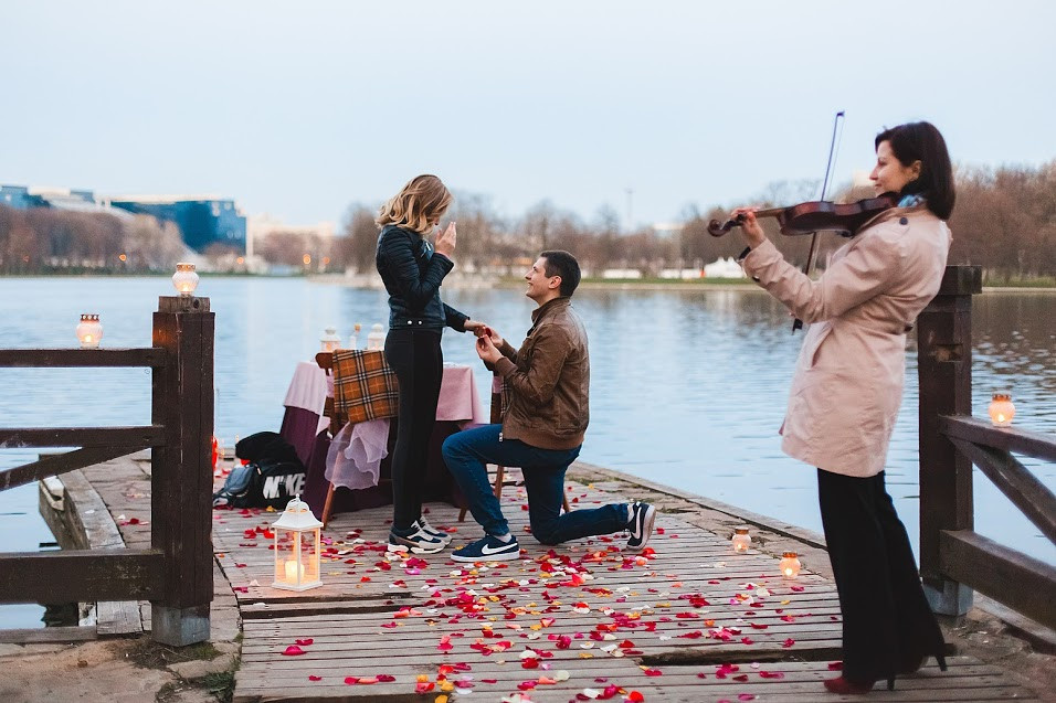 Он приглашает в кофе, только вы и он. Это ваша встреча и только ваша ни друзей и ни подруг. Только вы и он. Сидите за столом. Пьете вино, кофе, едите что то вкусное. И тут официант приносит еще одно блюдо. Она не видит, так как козел попросил ее закрыть глаза. И вот она открывает глаза и видит официанта с пустым подносом, мужчина берет с подноса маленькую коробочку открывает ее и преподносить женщине. Обручальное кольцо.