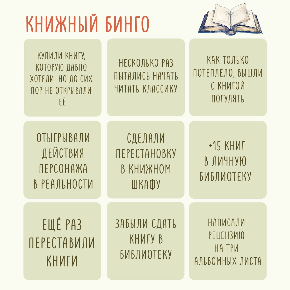 Бинго! 🧐 Остались считанные дни мая, а значит и весны. Время подвести итоги, книголюбы! Отмечайтесь в нашем бинго ✔️ Ну как, продуктивно прошёл этот сезон?