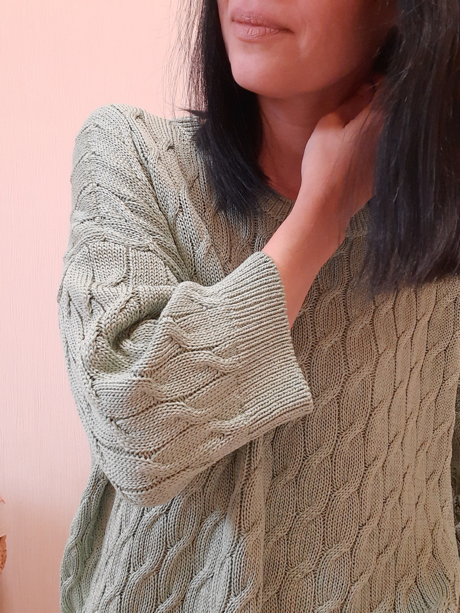 Резинки 1×1. Плечо спущенное, рукав с небольшим окатом, для лучшей посадки.