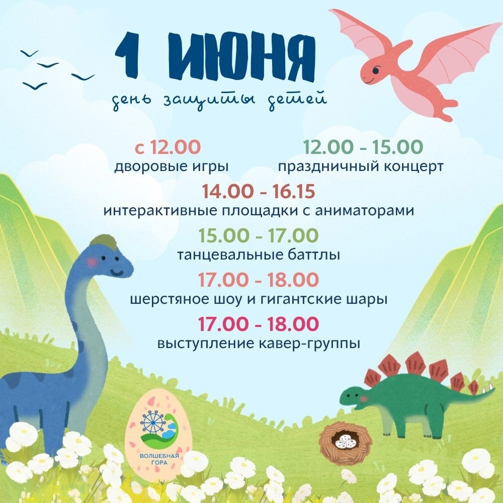 1 июня — День защиты детей в парке аттракционов «Волшебная Гора» 🎡 🎨 12:00 Проект «Дворовые игры» от Арт-студии им.Детства 12.00-13.00 Детский вокально-инструментальный ансамбль творческого клуба «Феникс» с программой «Кораблик» 💃 13.00-14.00 Выступления танцевальных коллективов: Dance Family, «Русские узоры», ТСК «Триумф» 14.00-15.00 Леди Баг и супергеройские конкурсы 🐇 14.00–15.00 Рисование с Зайкой для самых маленьких гостей 14.00–15.00 Студия эстрадного вокала ASTUDIO и Центр лечебной педагогики 👯♀️ 15.00–17.00 Танцевальные баттлы от Школы танцев «Dance Family» 15.15-16.15 Анимационная программа с элементами шоу от Единорожки 🪩 17.00–18.00 Шерстяное шоу и дискотека с гигантскими шарами 17.00–18.00 Выступление кавер-группы «Образцовый квартал» Оставайтесь с нами #НашаПсковскаяобласть