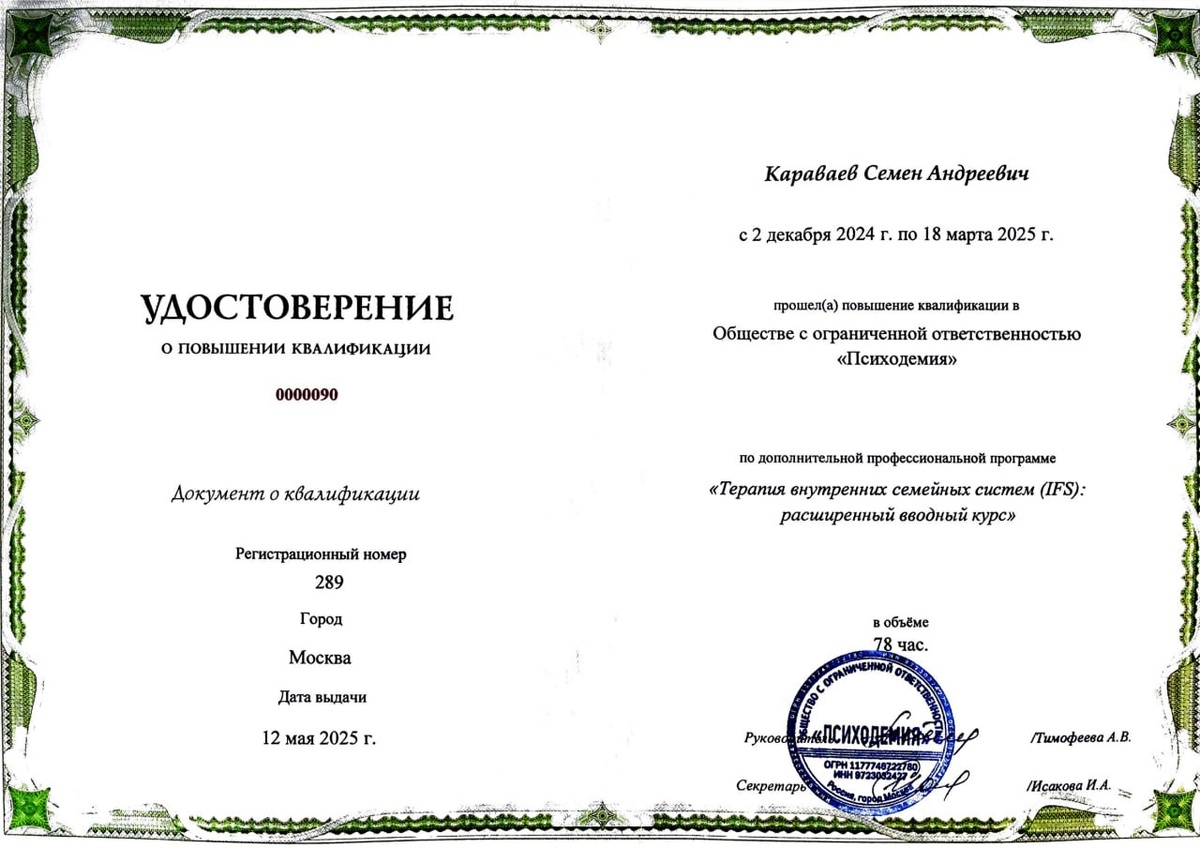 IFS Ура! Завершил ещё одно обучение, которое было мне очень интересно, потому что до знакомства с этим подходом я вообще мало что о нём слышал. Время снова очень быстро пролетело, и теперь я сам владею этим подходом. Терапия внутренних семейных систем (IFS) — это подход, который рассматривает нашу психику как внутреннюю систему разных «частей». Каждая такая часть имеет свои чувства, мысли и желания, и иногда они могут конфликтовать между собой. Главная задача этого подхода — помочь человеку познакомиться с этими частями, услышать их и наладить между ними гармонию. В центре этой системы находится «Я» — внутренний лидер, который может принимать решения с пониманием и заботой, выстраивая вокруг себя эти части. Мне всегда была ценна позиция, что клинический психолог просто обязан образовываться и не стоять на месте, потому что наша профессия развивается стремительными темпами, и нужно быть всегда в её контексте. Ну и любой подход — это про гибкость терапевта, а там, где гибкость, там