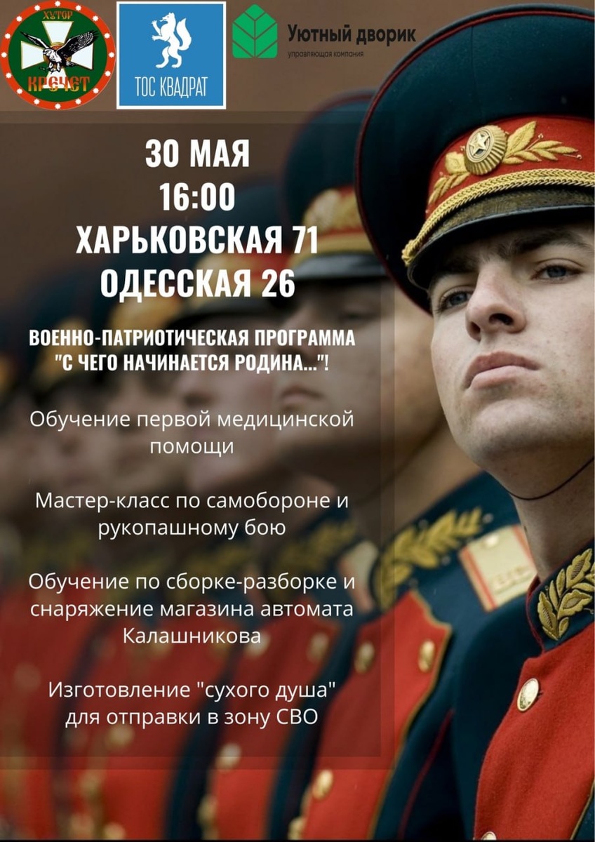 ТОС «Квадрат» «ИгроДвор— территория добрососедства» приглашает всех желающих посетить военно-патриотическое мероприятие «С чего начинается Родина…»! Мероприятие включает в себя: - обучение навыкам первой медицинской помощи; - обучение навыкам рукопашного боя и самообороны; - обучение навыков сборки, разборки и снаряжения магазина автомата Калашникова; изготовление «сухого душа» для отправки в зону СВО. 30 мая 2025 г. в 16:00 г. Тюмень ул. Харьковская 71/ул. Одесская, 26.