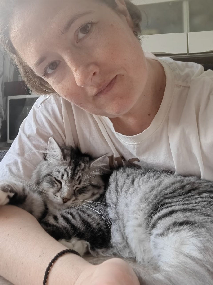 Подходит ко мне, боднет так слегка, что бы его обняли. Обнимаешь, он ложится и мурчит😍