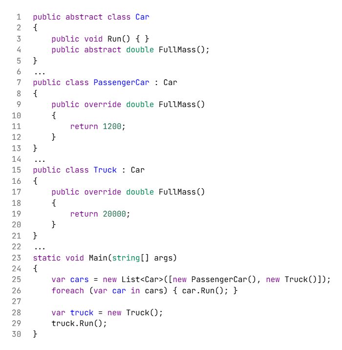 Наследование и полиморфизм две тесно связанные концепции для работы с абстракциями. Наследование определяет отношение "является" между абстракциями с разной степенью детализации, а полиморфизм определяет способы оперирования абстракциями. В программировании обычно выделяют три формы полиморфизма, которые различаются тем, что абстрагируется. Абстракция объектов через наследование. Все автомобили едут, все самолеты летают, а любой документ можно напечатать. В этом примере автомобиль, самолет или документ -- абстракция, определяющая общее поведение для реальных объектов. В программе мы для абстракций создаем классы, либо реализующие общее поведение, либо позволяющие это сделать наследным классам. Имея такой абстрактный класс мы можем использовать его поведение, не уточняя класс наследника -- ехать может и легковой и грузовой автомобили. Это работает и в другую сторону. Поведение базового класса доступно наследнику: грузовик может ехать, поскольку он автомобиль. В приведенном примере легко