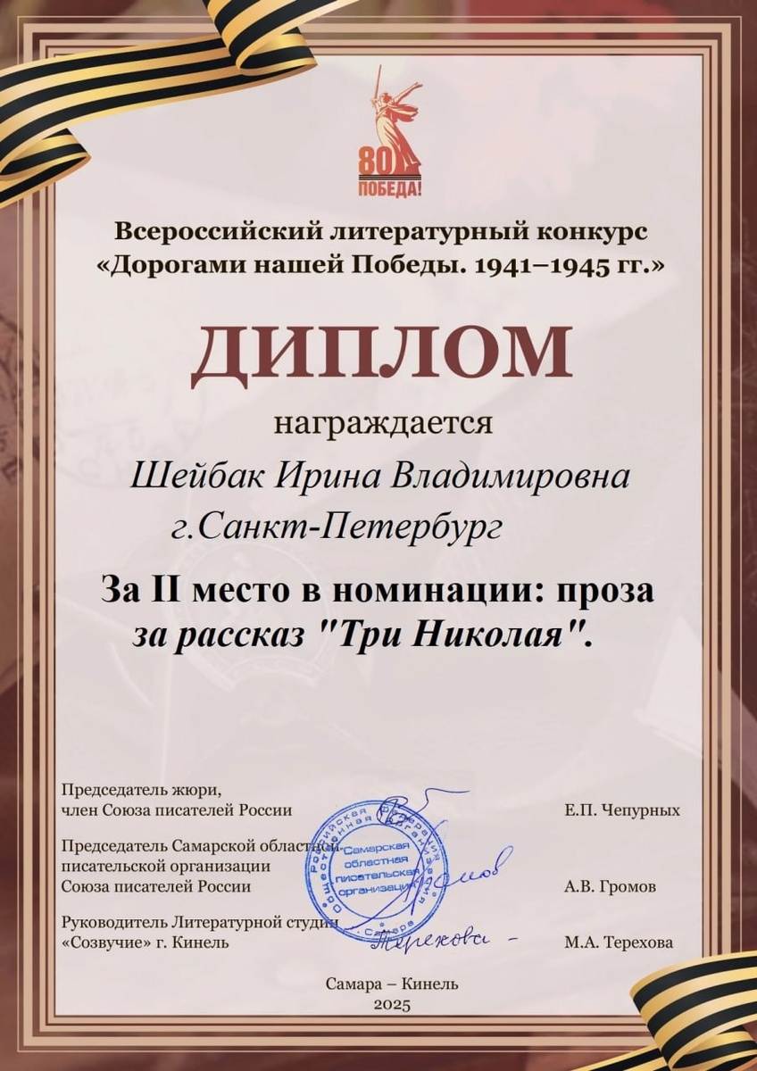 ✨ Дорогами нашей Победы с Ириной Шейбак В Самаре был проведён майский всероссийский литературный конкурс. Ирина Шейбак стала лауреатом II степени в номинации "Проза", а её ученица Ксения Метрусенко также получила степень лауреата II степени, однако в возрастной категории 14 — 18 лет. Поздравляем обеих девушек с победой! Ирина Шейбак — участник проекта «Завтрашние классики: воспитание через слово», реализуемого Союзом детских и юношеских писателей при поддержке Президентского фонда культурных инициатив.