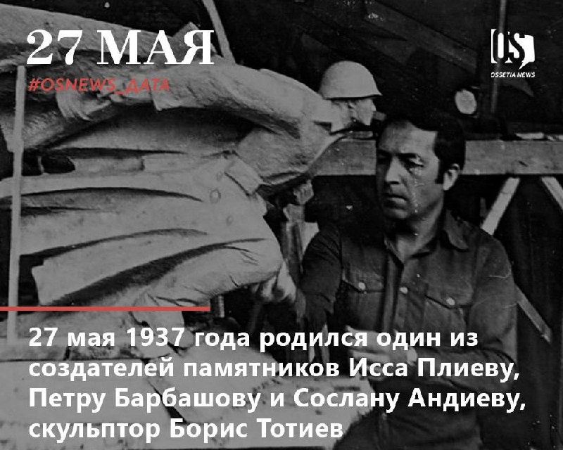 Сегодня, 27 мая, исполняется 88 лет со дня рождения известного скульптора Бориса Тотиева, который создал множество памятников и других произведений искусства, включая "Фатиму, держащую солнце", памятник комсомольцам Осетии, памятник С.М. Штыбу, барельефы у Эльхотовских ворот, легендарный "Т-34", а также монументы Героям Советского Союза Петру Барбашову и Иссы Плиева совместно с другими художниками.