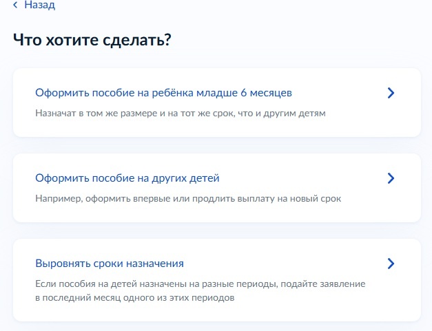 В разделе «Единое пособие на детей и беременных женщин» теперь предлагается 3 варианта действий: