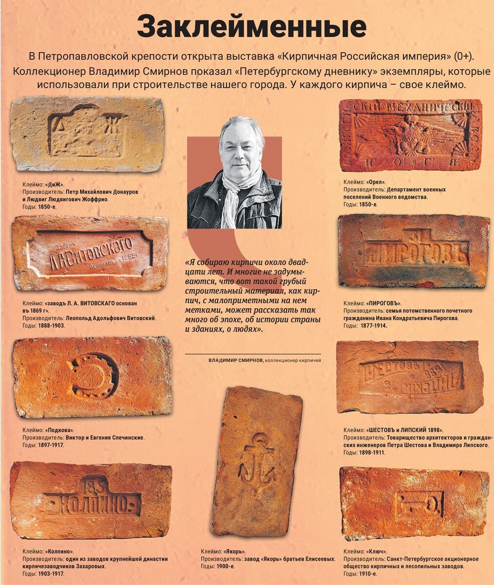 ⭐️ Заклейменные: в Петропавловской крепости открыта выставка «Кирпичная Российская империя» Коллекционер Владимир Смирнов показал «Петербургскому дневнику» экземпляры, которые использовали при строительстве нашего города. У каждого кирпича — свое клеймо. Петербургский дневник