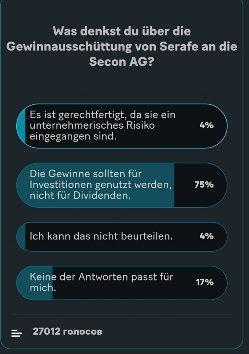 Что вы думаете о распределении прибыли от Serafe к Secon AG? Это оправдано, потому что они пошли на предпринимательский риск. 4% Прибыль должна быть направлена на инвестиции, а не на дивиденды. 75% Я не могу судить об этом. 4% Ни один из ответов мне не подходит. 17% 👀 25% - терпилы редкие