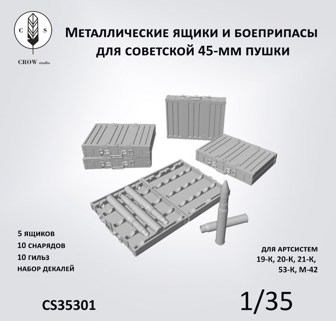 CROW Studio из Санкт-Петербурга выпускает на 3D-принтере ящики переноски для 45-мм снарядов советских пушек Великой Отечественной войны в масштабе 1/35 (в том числе, подходят и для их же модели артиллерийского передка).