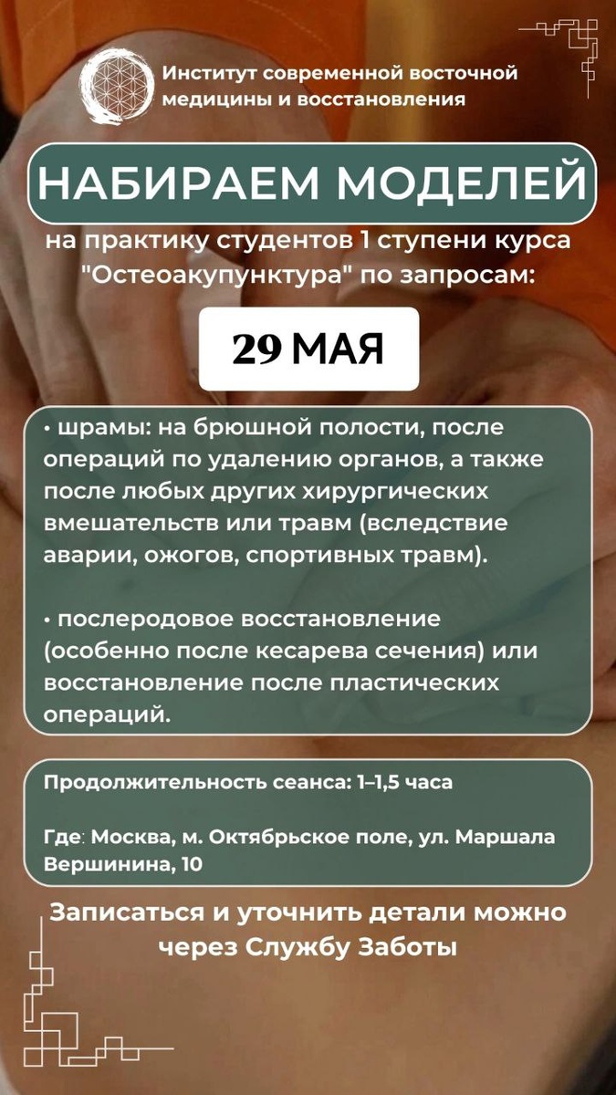 ❗️Дорогие друзья, важная новость! ⠀ У вас есть отличная возможность попасть на приём в Институт Современной Восточной Медицины — и при этом внести вклад в обучение наших будущих специалистов. ⠀ ❗️Идёт набор моделей на практику студентов 1 ступени курса "Остеоакупунктура"! ⠀ Когда: 29–30 мая Формат: индивидуальная отработка навыков под контролем преподавателя Продолжительность сеанса: 1–1,5 часа Где: Москва, м. Октябрьское поле, ул. Маршала Вершинина, 10 ⠀ 🫴 Если вы хотели познакомиться с методом на практике — это хороший шанс. ⠀ ✏️ Записаться и уточнить детали можно через нашу Службу Заботы ⠀ #ИСВМ #остеоакупунктура #восточнаямедицина