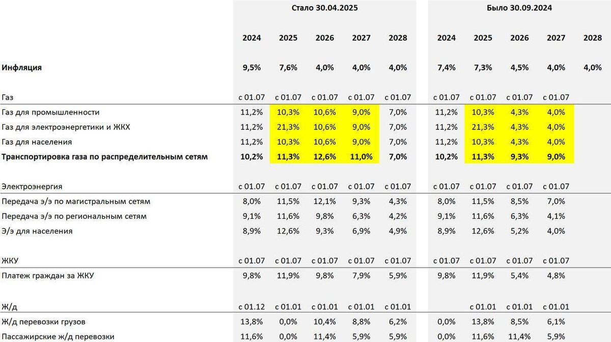 Тариф на распределение газа с текущего момента к лету 2028 года вырастет на 49%, а цена газа для населения на 42% Вечером 30-го апреля (видимо, чтоб никто не обратил внимания) Минэкономразвития опубликовало пересмотренные прогнозы по экономике и индексации тарифов, в т.ч. на газ и его транспортировку. Цены на газ в 2026-2027 годах будут индексироваться в два с лишним раза быстрее сентябрьского прогноза: 10.6% в 2026 году (вместо 4.6%) и 9% в 2027 году (вместо 4%). Газпром получил-таки свое повышение цен на газ для внутреннего рынка на ~50%, только оно будет размазано на три года. Тариф на распределение газа (по сетям облгазов) будет также проиндексирован ускоренными темпами: рост тарифа от текущего момента до лета 2028 года составит 49%. Еще обратите внимание на 2028 год. Тарифы на газ и его распределение вырастут на величину инфляция +3 п.п. (ранее этого периода в прогнозе не было). Почувствуй на цифрах, насколько важен теперь внутренний рынок для Газпрома! Ну и - интересно, ка