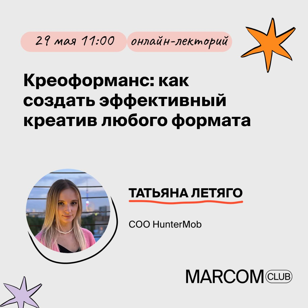 Сегодня креатив — это не просто визуал, а 80% успеха рекламной кампании. 🔥 На онлайн-лектории от Татьяны Летяго обсудим креоформанс — мощный союз креативного подхода и перформанс-инструментов, где каждая идея работает на захват внимания пользователя, победу над конкурентами в аукционе и рост конверсий. О чем поговорим на лекции: — Креативы: от performance и brandformance до UGC, OLV и баннеров; — Нативность креатива: рассказываем о сложных услугах просто — Особенности performance-креативов: как быть на одной волне с ЦА? — Call to action в креативной оболочке: 3 секунды, чтобы побудить к действию — Медийные креативы: принципиальные отличия от других форматов — UGC-креативы: максимальная нативность формата и отзывы юзеров — Различия в креативных подходах: найдем то, что подходит именно вашему бизнесу — Установки, клики и покупки: как креоформанс закрывает KPI И это лишь малая часть программы. Охватим всё, что нужно для продвижения с помощью креативного подхода! 🥷 Спикер лекции: Татьяна