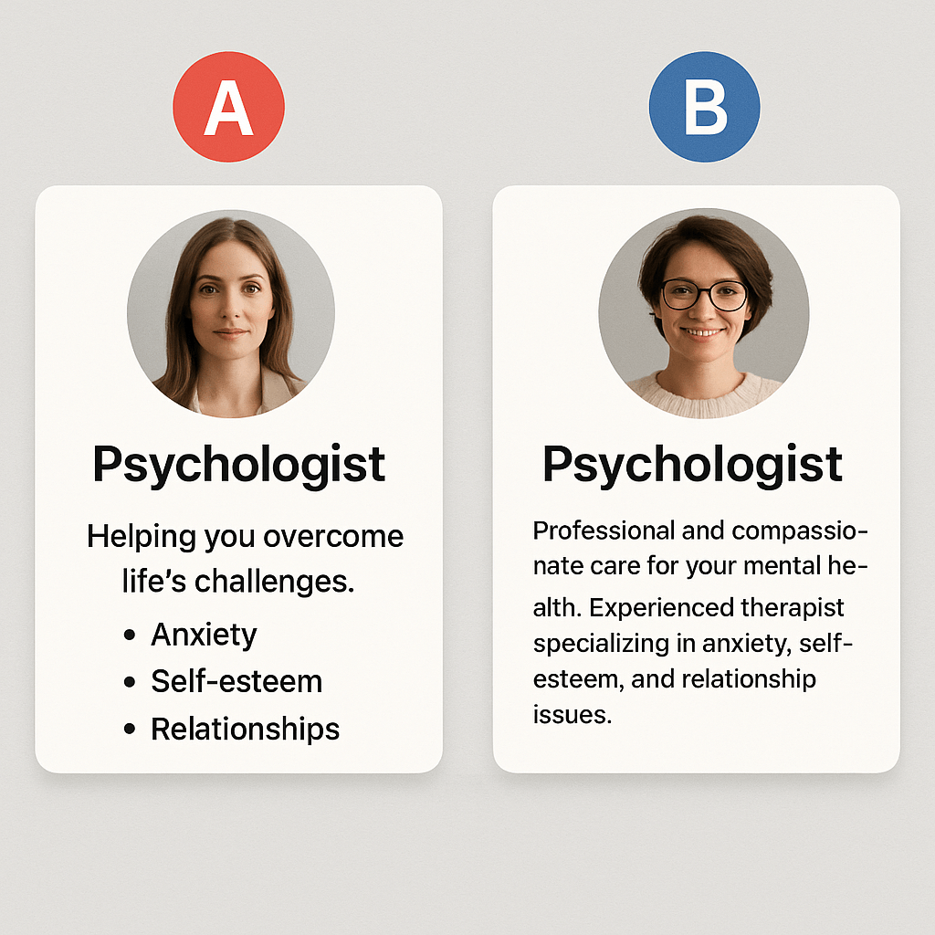 Кейс 3: Психолог-консультант протестировал две разные фотографии для профиля в социальных сетях: формальный портрет в кабинете и более непринужденное фото с книжной полкой на фоне. Второй вариант увеличил количество входящих сообщений на 28%.
