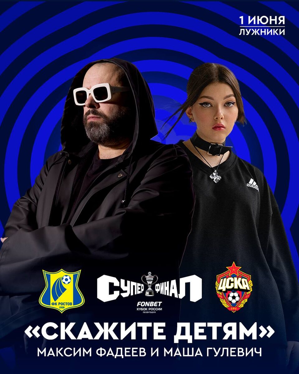 🎙 Максим Фадеев выступит на Суперфинале Кубка России дуэтом с юной белорусской певицей, участницей шоу «Голос. Дети» Машей Гулевич. Они исполнят песню «Скажите детям» — неофициальный гимн Дня защиты детей. Исполнение музыкальной композиции будет сопровождаться масштабным хореографическим номером с участием 160 юных танцоров. Предматчевая программа игры с участием «Ростова» и ЦСКА будет проходить под лозунгом «Великое начинается с детства». Встреча Суперфинала Кубка России состоится 1 июня в 18:00 мск на стадионе «Лужники». @russian_rt_sport