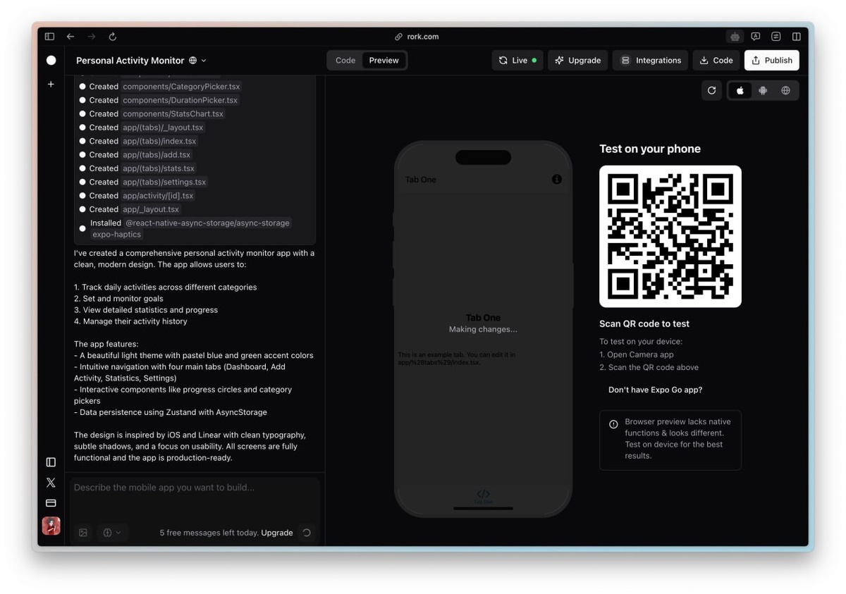Генератор мобильных приложений Rork получил значительное обновление: теперь создавать игры, социальные сети и другие сервисы можно прямо с мобильного устройства. Пользователи получили возможность выбирать между моделями (GPT-4o, Claude 4, Grok 3). Готовое приложение можно тестировать непосредственно на своем телефоне и публиковать в App Store или Google Play. Бесплатно доступны пять генераций в день, так что стоит попробовать свои силы. Узнать больше можно здесь. Наш уютный канальчик 🤖 Анимация | СhatGPT-4 | Помощь с резюме