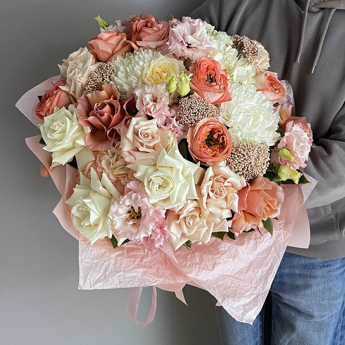 Представьте себе момент, когда слова замирают на губах, а сердце переполняют чувства. Именно в такой миг этот пышный букет, искусно собранный мастерами ArtCraftBouquet, станет вашим красноречивым посланием о любви. Выполненный в самых нежных, пастельных розовых, кремовых и зеленых тонах, он создан, чтобы выразить всю глубину ваших чувств.