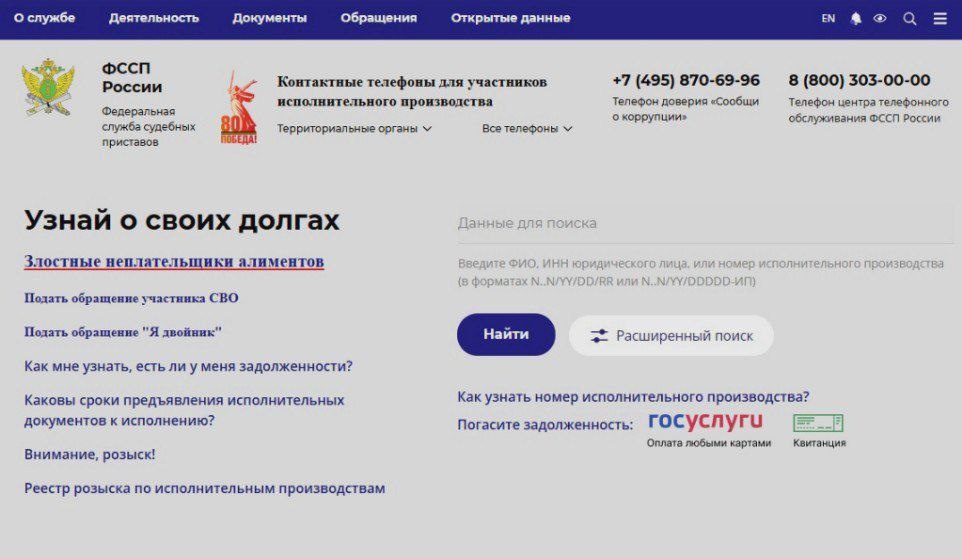В этом разделе пользователи могут осуществлять поиск по фамилии, имени, отчеству и дате рождения должника.