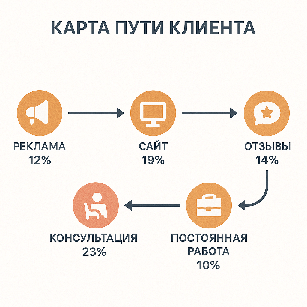 Комплексный анализ пути клиента показал, что существует 7 ключевых точек взаимодействия, определяющих успех психологической практики: