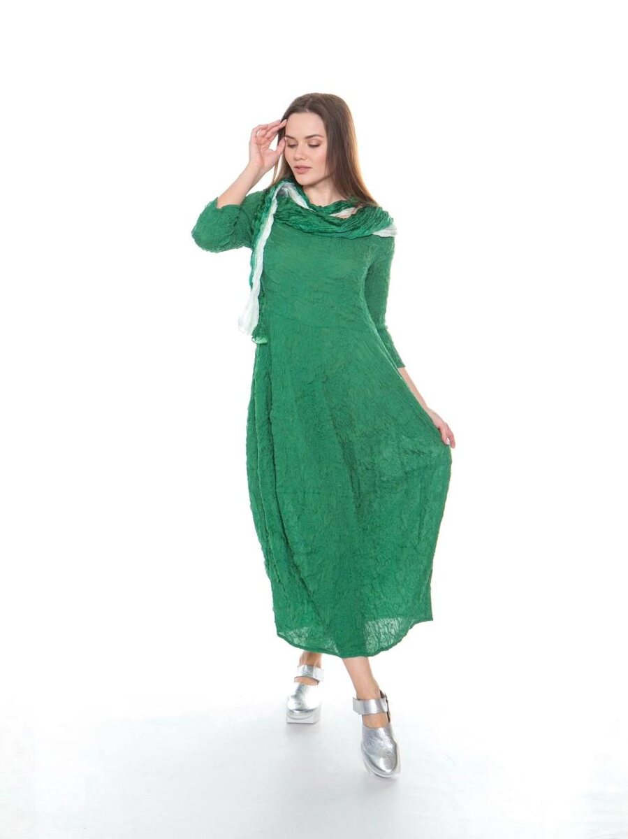 Длинные рукава, лаконичный вырез и выразительный цвет — зелёный, близкий к оттенку драгоценного камня, — делают платье универсальным выбором как для особого случая, так и для вечернего выхода в городе.