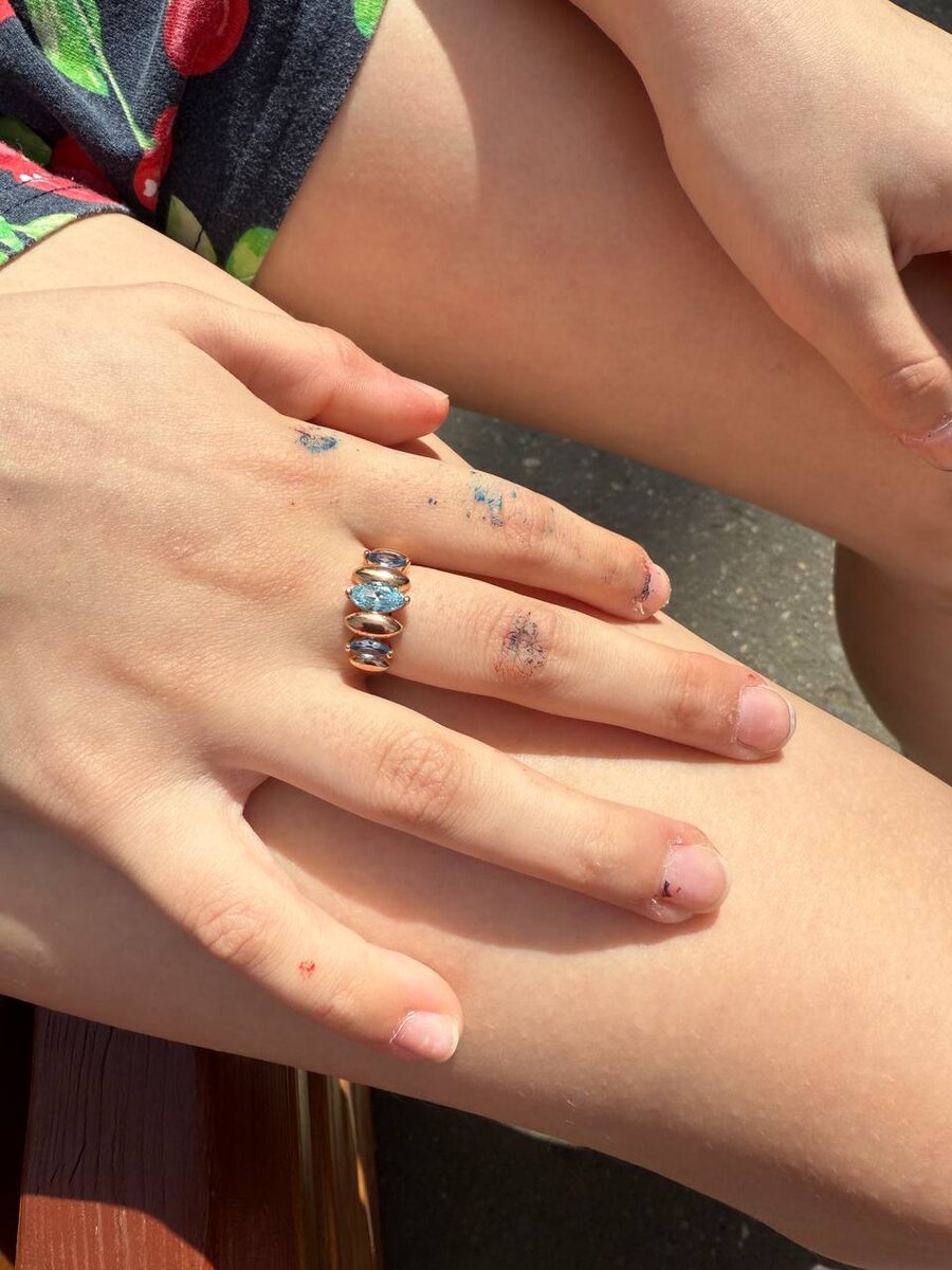 Сходили с сыном и, с Есенией в магазин. По плану была покупка детского купальника и босоножек. Всё купили! Да ещё купальник по акции достался, по смешной цене,как последний размер. Босоножки тоже надели сразу, а чего тянуть!)) Плюс Есении захотелось колечко. Первый раз, она сама попросила украшение. Купили с голубыми камешками, её любимый цвет. Не бижутерия. Еле подобрали размер. Не обращайте внимания на руки, это краска😃.