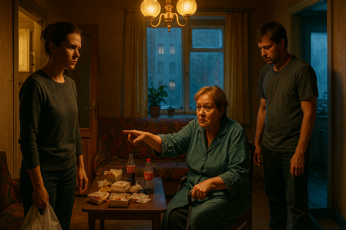 Ольга устало вошла в квартиру свекрови, сжимая пакет с диетической едой. Елена Николаевна, восседая на диване, ткнула пальцем в пустой стол: «Где кола, Оля? Я же просила!»