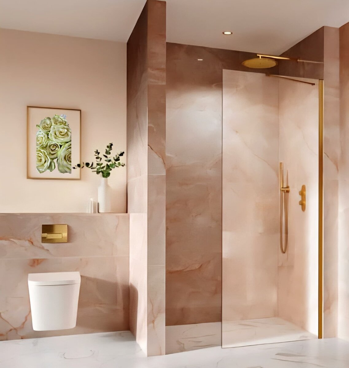 Уровень нежности просто зашкаливает! Спелый бархатистый персик, в сочетании с мрамором, в интерьере, уже не выглядит громоздко и холодно. Этот нежный пастельный оттенок ассоциируется с бархатистой поверхностью плода персика и создает ощущение тепла и нежности, а вместе с этим уют и комфорт. Это нетипичное для санузла цветовое решение, но очень удачное, для любителей пастельных тонов. Оживит любой интерьер и отлично подойдет для северных комнат, куда нечасто попадает солнечный свет. Сам по себе мрамор является благородным камнем и даже есть такое правило, хотите, чтобы интерьер выглядел дорого, добавьте туда мрамор. Ну правила правилами, а выглядит мрамор действительно респектабельно, а уж персиковый тем более. Это редкий материал, но существуют разновидности мрамора с персиковыми оттенками. Альтернативой натуральному мрамору могут послужить множество вариаций искусственного камня или имитаций в виде панелей. Персиковый мрамор идеально сочетается с белым, бежевым, черным, зеленым, голуб