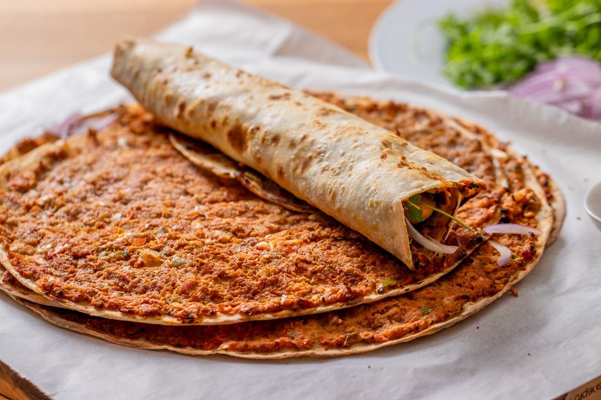Лахмаджун часто называют пиццей по-турецки, хотя на самом деле он ближе к тонкой лепешке с ароматной мясной начинкой. Его подают, свернув рулетом, с зеленью и лимоном — получается сытно, свежо и вкусно.