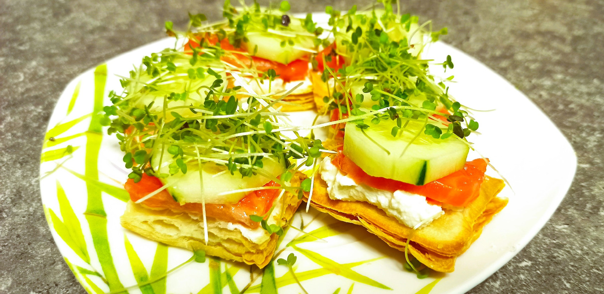 • микрозелень редиса, рукколы и горчицы, кресс-салата если, конечно, вас не будут каждые пять минут отвлекать с просьбами «а можно кусочек огурца?» или «я тоже хочу мазать!» 😅 Размораживаем пласты теста. Каждый, не раскатывая, разрезаем на 9 квадратов. Аккуратно выкладываем их на противень, присыпанный мукой, или на силиконовый коврик. Отправляем в духовку, разогретую до 180 °C, на 10–15 минут. Тесто