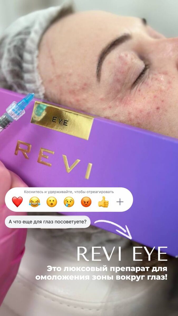 REVI Eye — деликатное омоложение зоны вокруг глаз Если беспокоят тёмные круги, сухость, мелкие морщинки — REVI Eye решает всё сразу. Препарат на основе гиалуроновой кислоты и янтарной кислоты запускает восстановление кожи, улучшает цвет и текстуру, при этом выглядит максимально естественно. Свежий, отдохнувший взгляд — уже после первой процедуры.