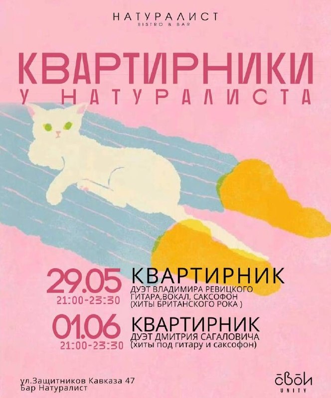 Вечер акустических рок-хитов в Натуралисте 🗓 29 мая и 1 июня, 21:00 📍 ”Натуралист”, Защитников Кавказа, 47 📞 +7(862)243-78-07 📍 Вход свободный 29 мая — британские хиты 6 июня — вечер саксофона 🎵 Интересный Сочи