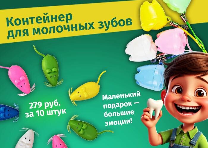Чтобы стать частью этой замечательной истории предлагаем вам обратить внимание на милый сувенир - контейнер для молочных зубов. Он сохранит памятный момент и принесет лояльность вашей клинике на долгие годы. 10 ярких боксов, выполненных в форме зубиков или очаровательных мышек, станет отличным подарком ко Дню защиты детей.