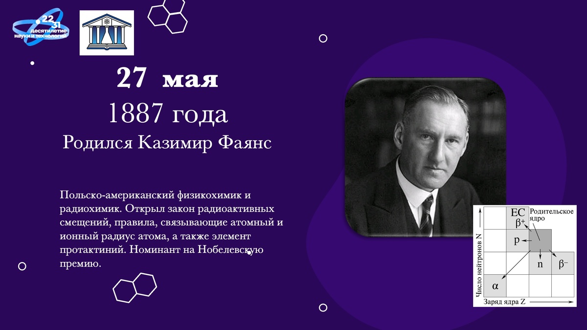 138 лет назад на территории Российской империи, в Варшаве, родился один из пионеров радиохимии, внесший вклад и в органику, и в физхимию - Казимир Фаянс (1887-1975). Вклад Фаянса в химию огромен. Это и закон радиоактивных смещений, сформулированный им независимо от Содди, это и определение полураспадов многих нуклидов - вместе с Мозли, в период работы у Резерфорда. Это и догадка про изотопы, за которую Содди потом получит Нобелевскую премию, это и метод частичного разделения оптических изомеров, и правила Фаянса, которые показывают зависимость между атомным и ионным радиусом, и термодинамический цикл Борна-Габера, который по справедливости стоит называть циклом Борна-Фаянса-Габера, и многое, многое другое. Включая открытый им элемент протактиний. И, к слову, семь номинаций на Нобелевскую премию в 1923-1934 годах - это тоже очень сильно. Мы напишем биографию ученого на нашем портале. #деньвисториихимии Материал подготовлен ИОНХ РАН для проекта «Виртуальный музей химии: продолжение осмо