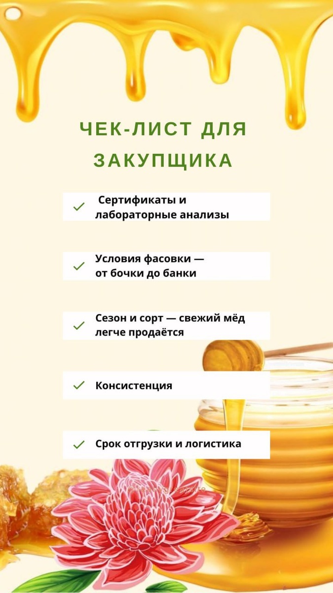 📋 Что важно проверить перед закупкой мёда — чек-лист для закупщика Закупка мёда — это не только «вкусно» и «дёшево». Это ещё и ответственность. Особенно, если вы берёте продукт под реализацию, переработку или подарочную упаковку. Вот 5 пунктов, которые мы рекомендуем проверять при любой закупке: ✅Сертификаты и лабораторные анализы — убедитесь, что документы соответствуют ГОСТ и объёмам партии ✅Условия фасовки — от бочки до банки: важно понимать, где и как фасуется мёд ✅Сезон и сорт — свежий мёд легче продаётся, а у сортов есть своя специфика (вкус, цвет, аромат) ✅Консистенция — кристаллизуется ли, насколько жидкий ✅Срок отгрузки и логистика — чёткие сроки, стабильная доставка ⠀ 📦 Всё это мы предоставляем до заключения сделки. Открытость — наш принцип. ⠀ 📞 Хотите проверить наш подход — пишите: 8 (989) 228-13-33 📍 г. Кореновск, ул. Маяковского, 79 #юговойопт#полезнозакупщику#мёдоптом#чеклистзакупки#командаюгового#проверенныйпоставщик#работаемпрозрачно