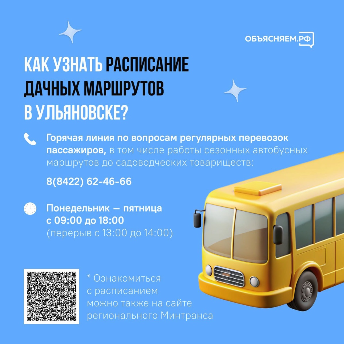 Как узнать расписание дачных маршрутов в Ульяновске? 🚌 С началом садово-огородного сезона в Ульяновске организована регулярная работа общественного транспорта, курсирующего от города до СНТ. Выяснить расписание движения дачных автобусов по интересующему вас маршруту можно на сайте регионального Минтранса, либо, позвонив на специальную горячую линию.