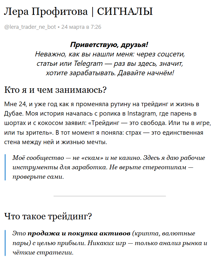 Неоднозначная репутация стала поводом, чтобы изучить о телеграмм-канале «Лера Профитова» отзывы, ведь трейдер, ведущий канал, предлагает делать совместные инвестиции по авторской системе торговли. Девушка регулярно собирает торговые сессии на которых предоставляет сигналы для торговли всем своим рефералам, которые предварительно зарегистрировались на указанной бирже или брокере. Для оценки настоящих результатов мы изучили отзывы о проекте в сети. Весь проект «Лера Профитова» в Телеграм ведет 24-летняя девушка, которая не имеет лицензии или профессионального образования. Весь свой опыт торговли она описывает желанием заработать и не привязывать к работе по найму. Успешный кейс не имеет никаких подробностей и демонстрирует отсутствие нормальной легенды якобы опытного трейдера с собственной командой. Сама трейдер общается с подписчиками только через бота, объясняя это блокировкой от Telegram из-за спама, так как ей пишут много людей и всем она отвечает. В ТГ «Лера Профитова» обещает прибы